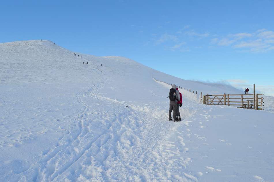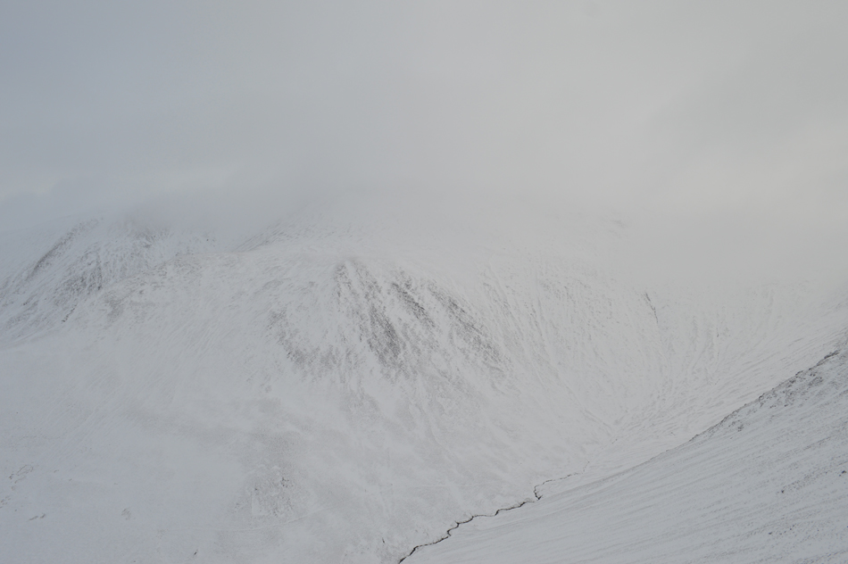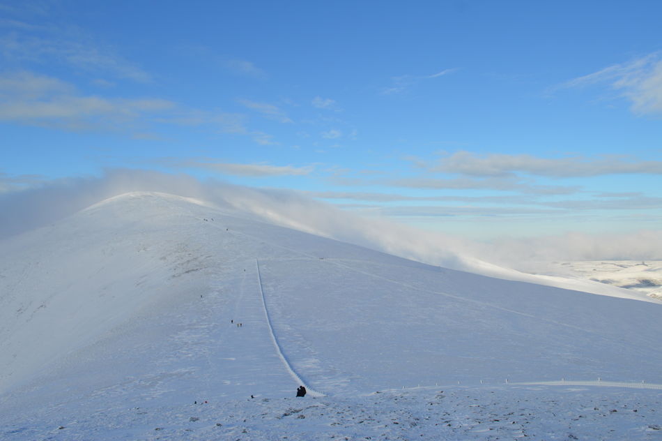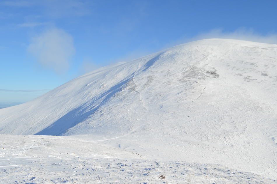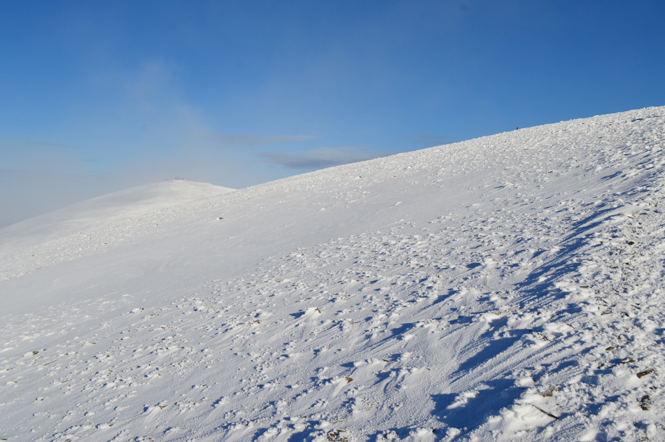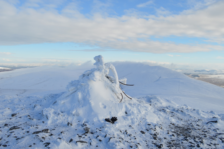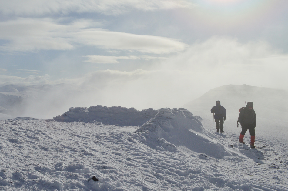 Lesser Man was soon reached as the brutality of the windchill continued, it was here we were joined by more walkers most of whom were ill-equipped carrying the likes of small pug dogs (we counted three in total) which whimpered in the severe cold, most owners had the sense to realise that they were in to deep and turned back while others had a discreet advisory. |