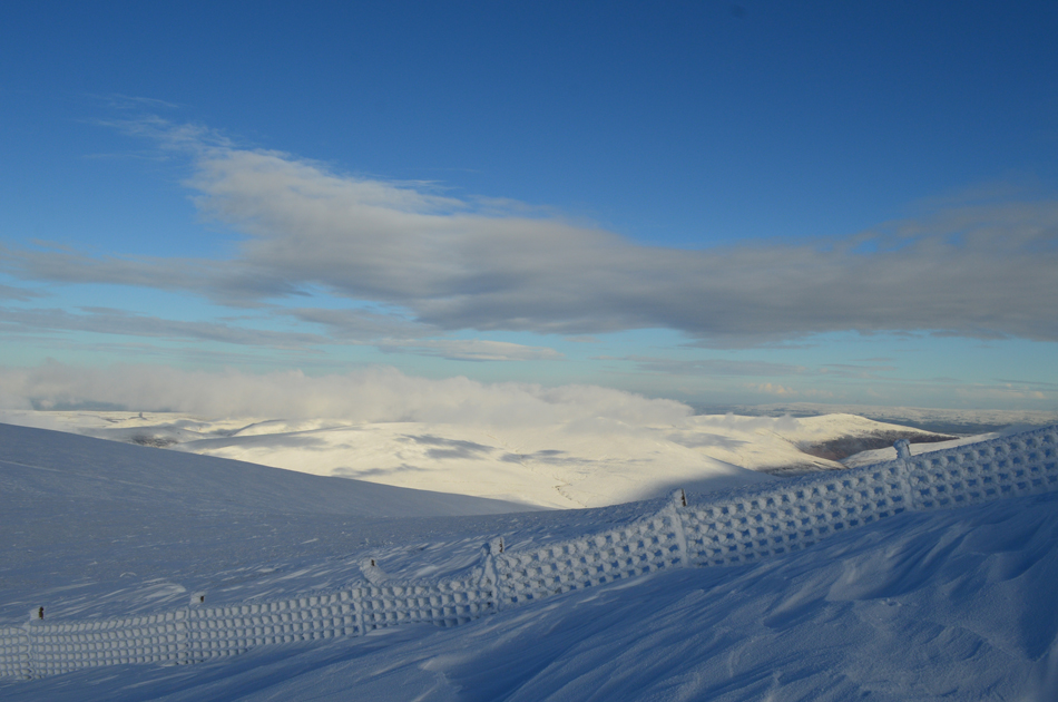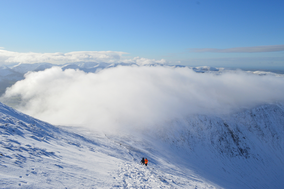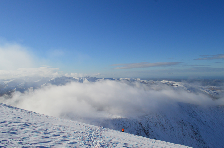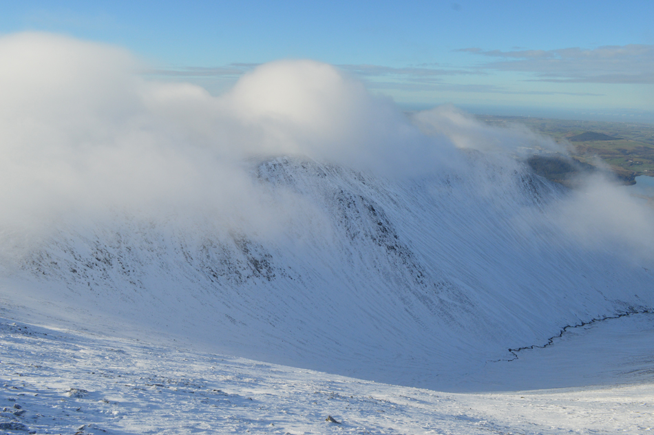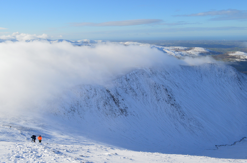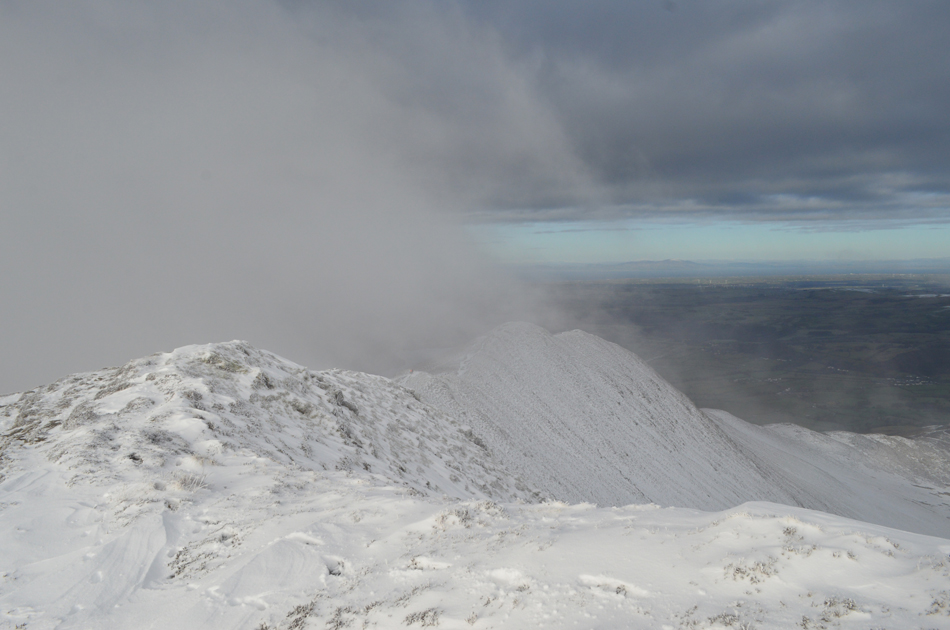 The next few moments was spent watching the cloud peel away from the ridge revealing blue skies in the distance and Carl Side below which is where we are heading next, not before we de-shoulder again to add our Winter gloves owing to the windchill we were now experiencing. |