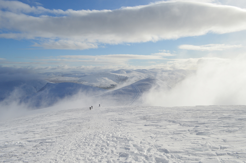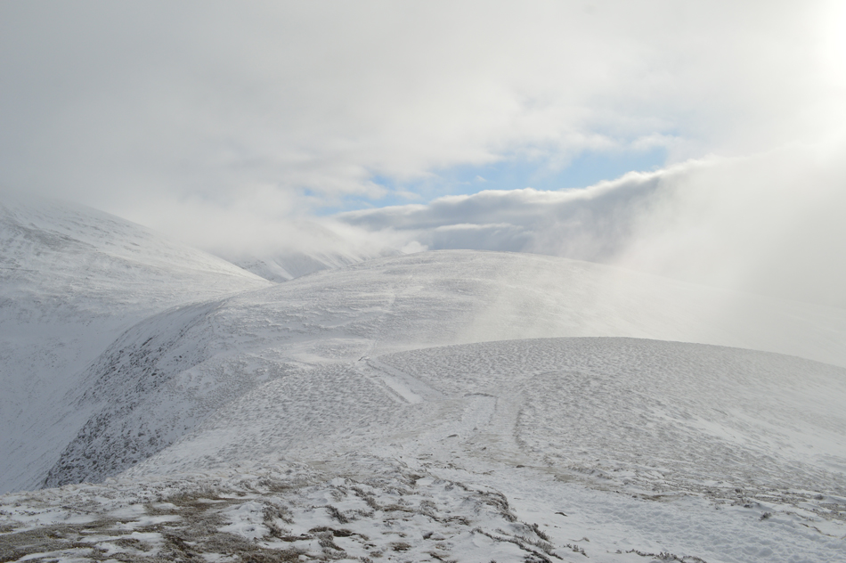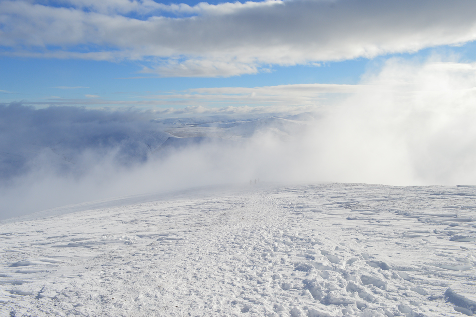 We again had made the summit just in time before more cloud arrived which lingered as we passed the south cairn before descending out of the cloud which hurtled across our field of vision at a rate of knotts. |