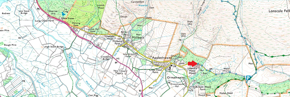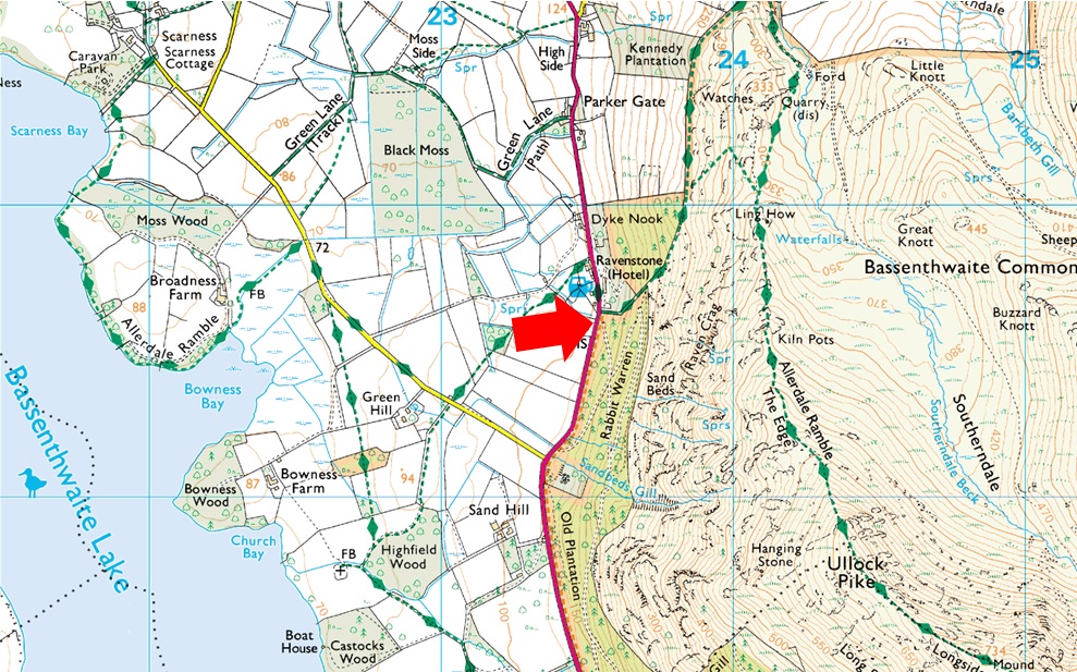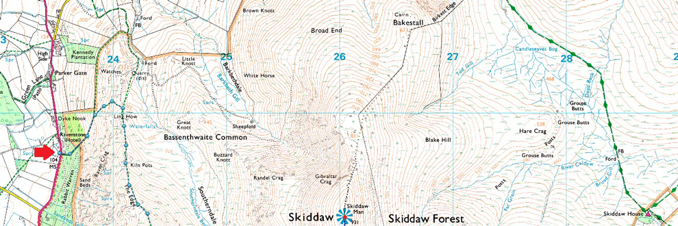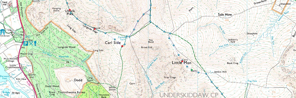 Ravenstone Hotel - Ling How - The Edge - Ullock Pike - Long Side - Carl Side - Skiddaw - Skiddaw Little Man - Skiddaw Lesser Man - Hawell Monument - Gale Road - Underscar Hotel |