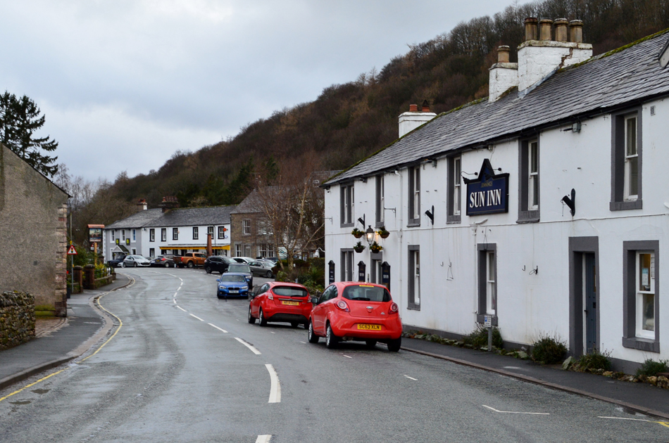 We left Roehead wintered up to the nines and started to walk back towards Pooley Bridge while kicking debris and fallen branches to the side of the road and we wern't surprised to find we hadn't been passed by any traffic in the time it took us to reach the crossroads at the bottom of Roe Head Lane. Pooley Bridge was as deserted as it looked and we were able to walk along the centre of the road all the way through the village passing a worker at the Pooley Bridge Inn who was sweeping up outside. Pooley Bridge will always bring back fond memories of the Summers I spent here camping as we share which pub we thought served the best food, for me it was the Sun Inn seen here on the right. |