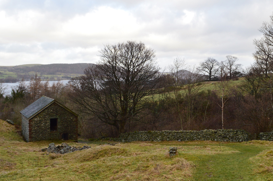 Looking back on a two story barn at Swarthbeck before we link up with the Roehead / Howtown path. |