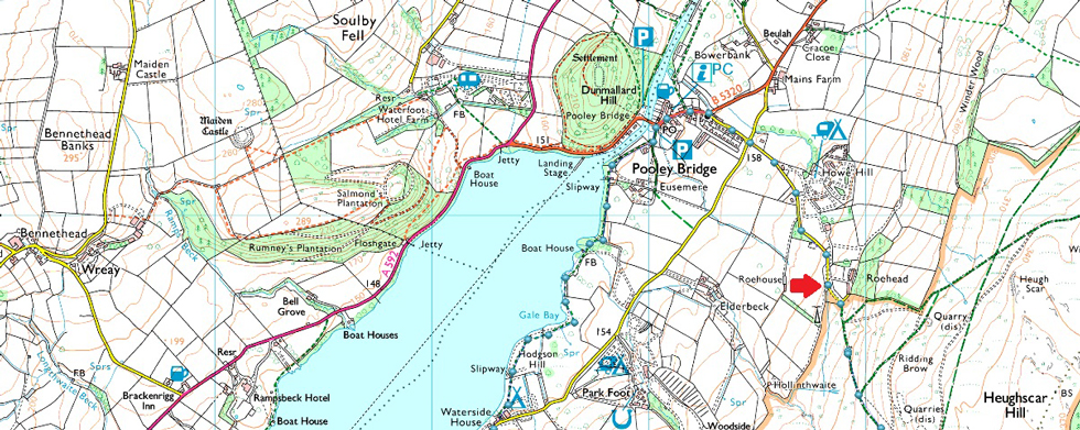 There is roadside parking at Roehead just outside Pooley Bridge with room to park up to ten cars. This is a really popular spot to start a walk with Arthur's Pike and Heughscar Hill close by. Finding Roehead is pretty much straight forward just head straight through Pooley Bridge, slight right at the Church until you arrive at a T Junction, head straight on for about half a mile before arriving at the Roehead. Parking is free. |