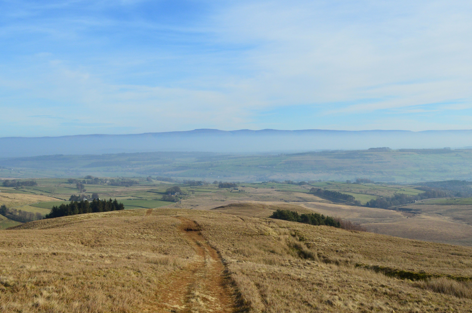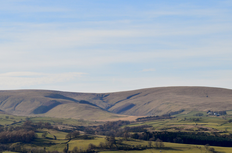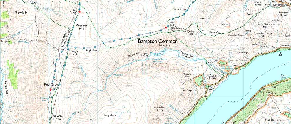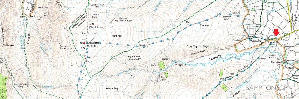 After crossing Cawdale Beck Low Kop is gained via The Hause, a distinctive narrowing of the ridge distinguished by woodland either side. Haweswater can now be seen in particular the Dam wall below the Naddle Fells. Continuing from Low Kop the parent summit of High Kop is gained as views unfold over Keasgill Head with Red Crag beyond. Red Crag is next which is easily gained before returning to the top of Keasgill Head before the gentle ease on Wether Hill, the head of the Cawdale valley. Loadpot Hill is next gained by following the High Street Roman Road passing the remains of the Lowther Chimney, a former shooting lodge. Due east from Loadpot Hill is Hart Hill from where the Pennines command the horizon before the ground underfoot levels as The Pen is reached as views open out northwards over Heltendale towards Heughscar Hill before arriving back Moorahill Farm. |