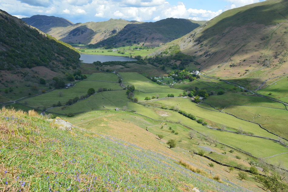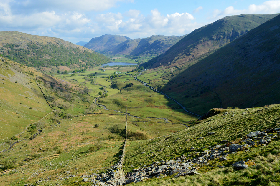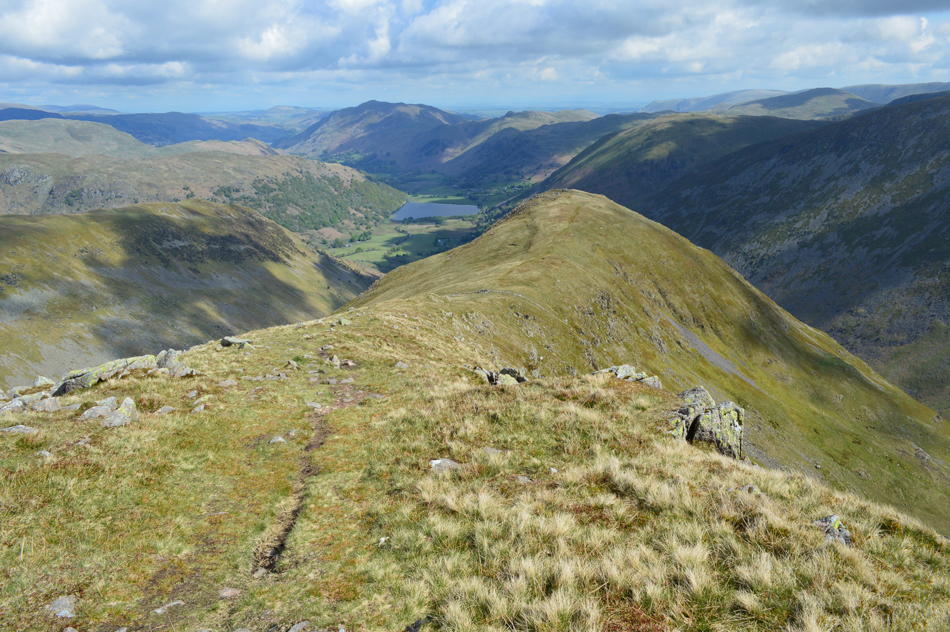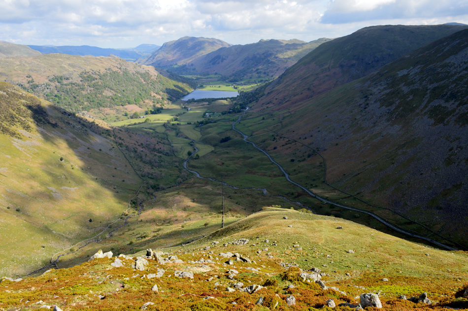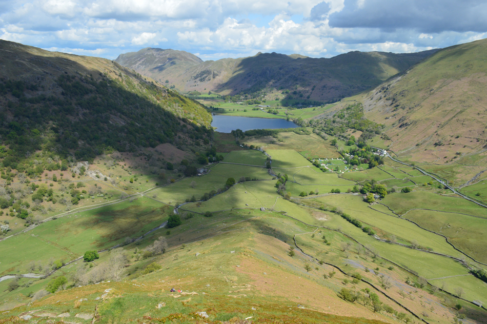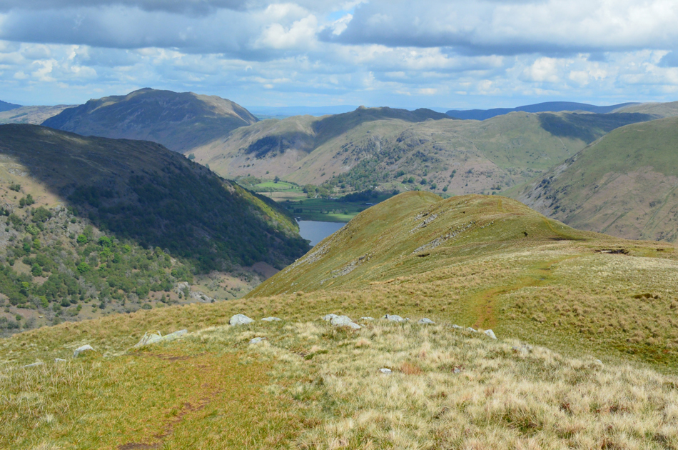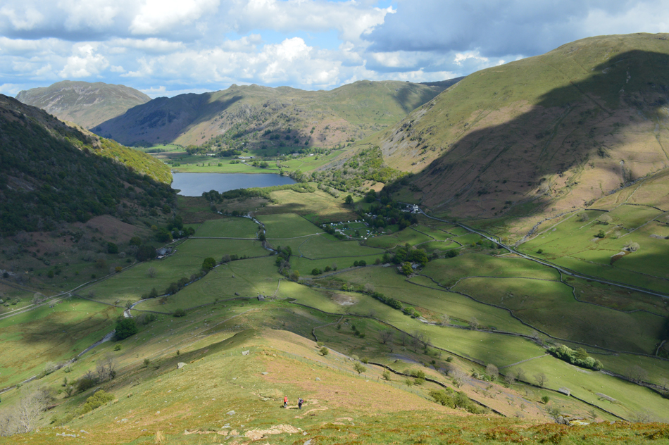It was all down hill from Little Hart Crag most of which was done under glorious sunshine and we left the cool summit winds behind for warmer valley temperatures, with one of the best views over Brothers Water and beyond we arrived at the ancient settlement in the grounds of Hartsop Hall and double backed below the ridge crossing Kirkstone and Caiston Becks before arriving back at the cars in glorious sunshine. |