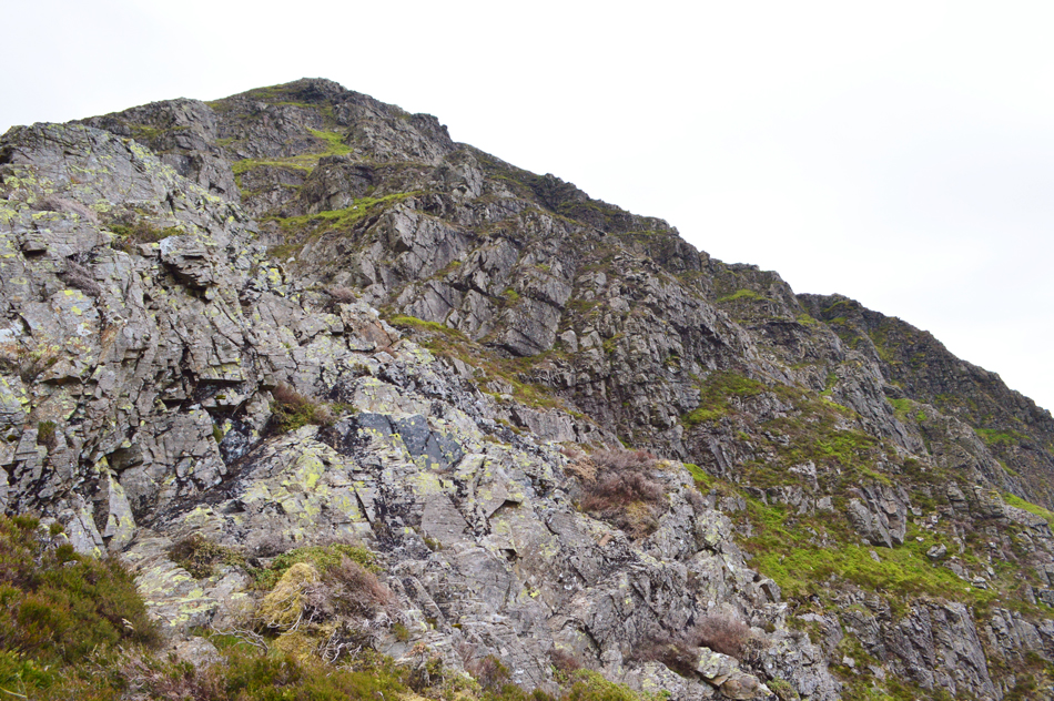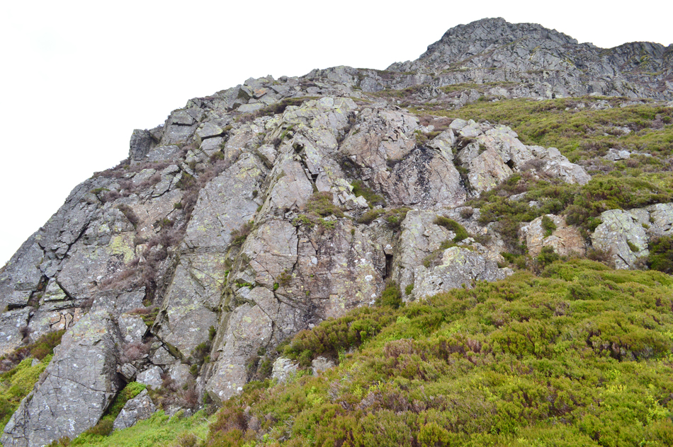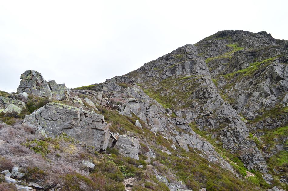 Our point of contact is to the left of the crags ahead from where we would ascend a grass rake which reminded Wainwright of Lord's Rake but before we make any comparisons we need to reach the heather up ahead. |