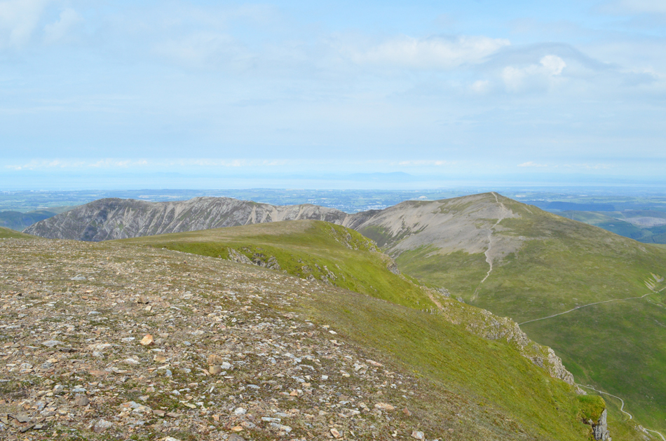 The view over Eel Crag's Tower Ridge (seen below) towards Sail, Scar Crags, Outerside Causey Pike and Barrow. |