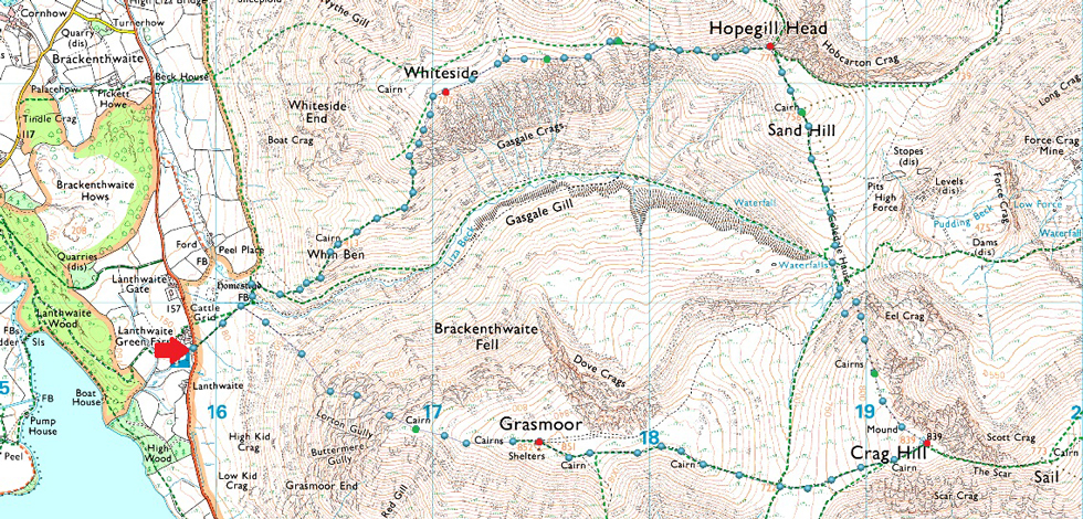 Lanthwaite Green - Grasmoor North West Ridge - Grasmoor End - Grasmoor - Eel Crag (Crag Hill) - Eel Crag - Coledale Hause - Sand Hill - Hopegill Head - Whiteside East Top - Gasgale Crags - Whiteside - Whin Benn - Liza Beck - Lanthwaite Green |