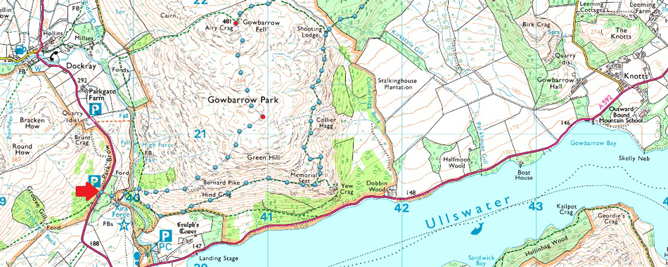 Park Brow - Aira Force - Bernard Pike - Green Hill (Gowbarrow Park) - Gowbarrow Fell - Great Meldrum - Little Meldrum - Watermillock Fell - The Hause - Little Mell Fell - The Hause - Road to Watermillock - Swinburn's Park - Memorial Seat - Aira Force - Park Brow |