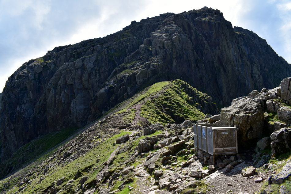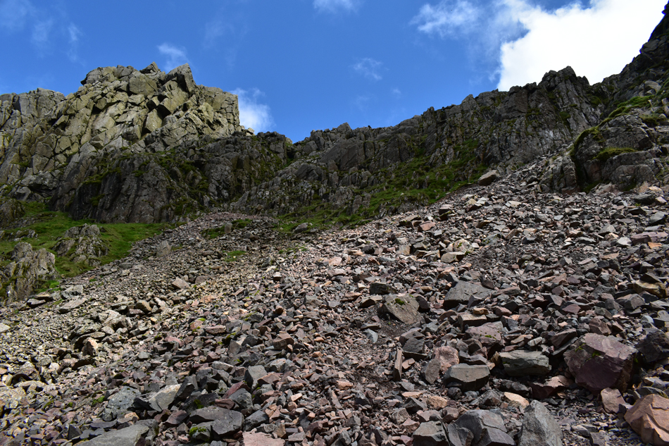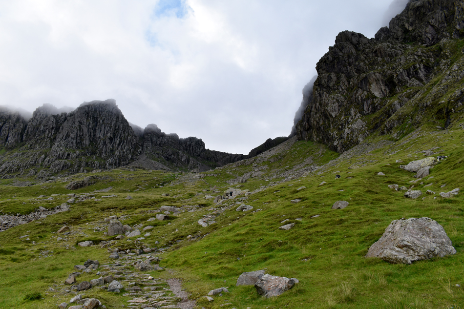I left the crowds and forked right at the head of Brown Tongue, not before chatting with a couple from Switzerland who were ascending Scafell Pike for the first time. I continued along the path now flanked by Scafell Crag to my right at a point when it started to cloud over and in some sections of the path I was passing through 'cold spots' where I could see my own breath, blimey I reckon now would be a good time to add an extra layer. |