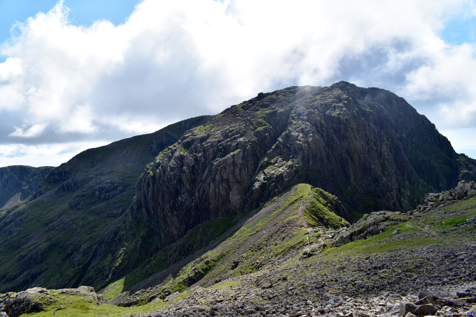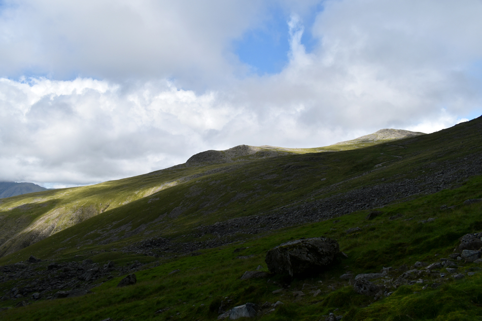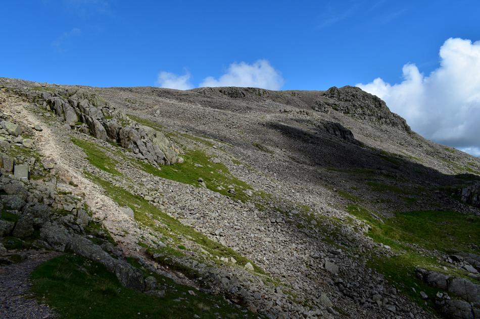 Having crossed the footbridge over Lingmell Beck I joined the path on the steep flank of Lingmell finding the groups who had left Wasdale Head earlier up ahead who I caught up. Here the path is narrow and rocky and passing people who are in conversation was proving a little tricky at a point when I felt like I could have actually joined in! I managed to wrangle my way around the groups which in the afternoon heat picked at my reserves very early but at least I had broken away soon finding myself looking up on Brown Tongue while Scafell Pike was still immersed in cloud. |