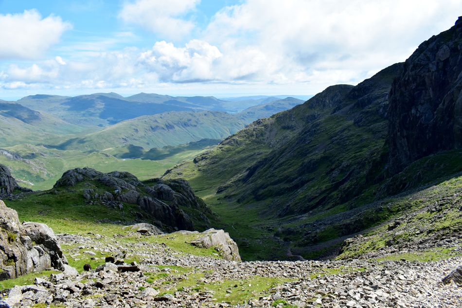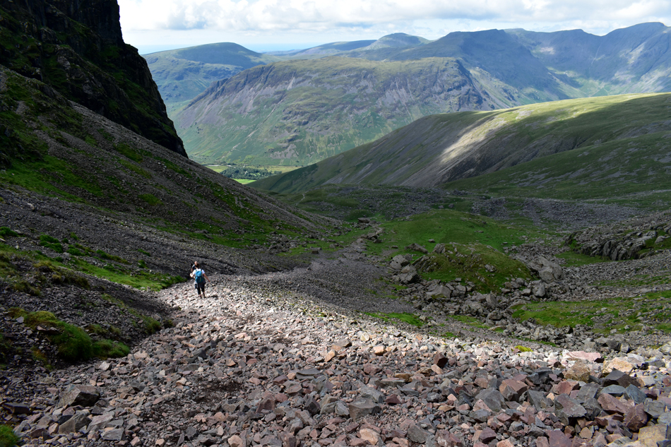 In this photo you can see the path I ascended Mickledore earlier over on the far right while the main path from Wasdale Head passes above Hollow Stones in the foreground. |
