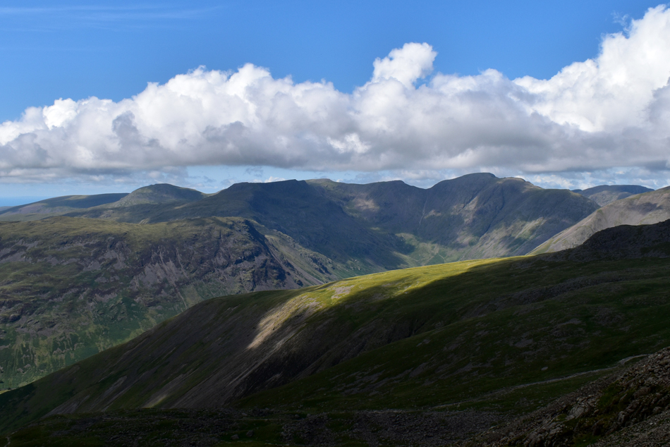 Looking over Hollow Stones towards the top of Brown Tongue, Lingmell, Yewbarrow, Seatallan, Haycock, Red Pike, Scoat Fell and Pillar. |