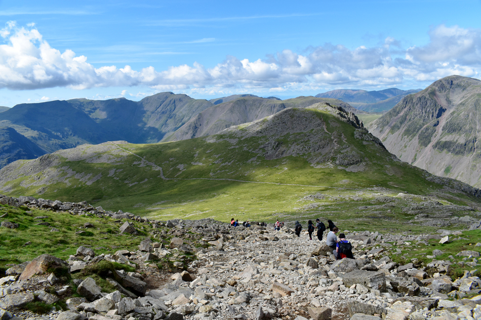 I re-ascend slightly while taking a line towards the cairned path Lingmell Col bound, it is here I pass the couple from Switzerland again who ask "how far?" ten minutes I smile. By now it's really starting to warm up and more people are taking breaks than are on thier feet and who could blame them. |