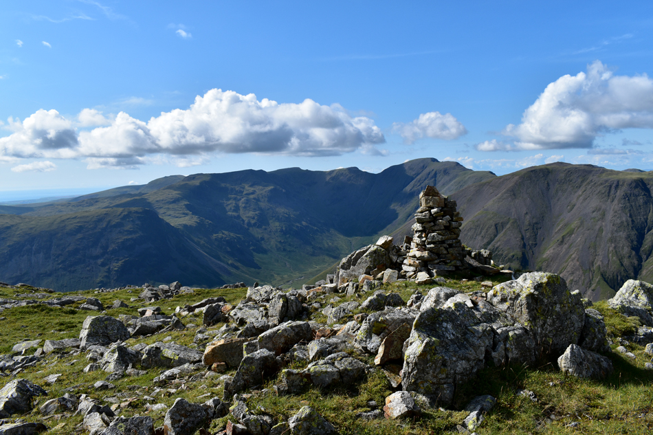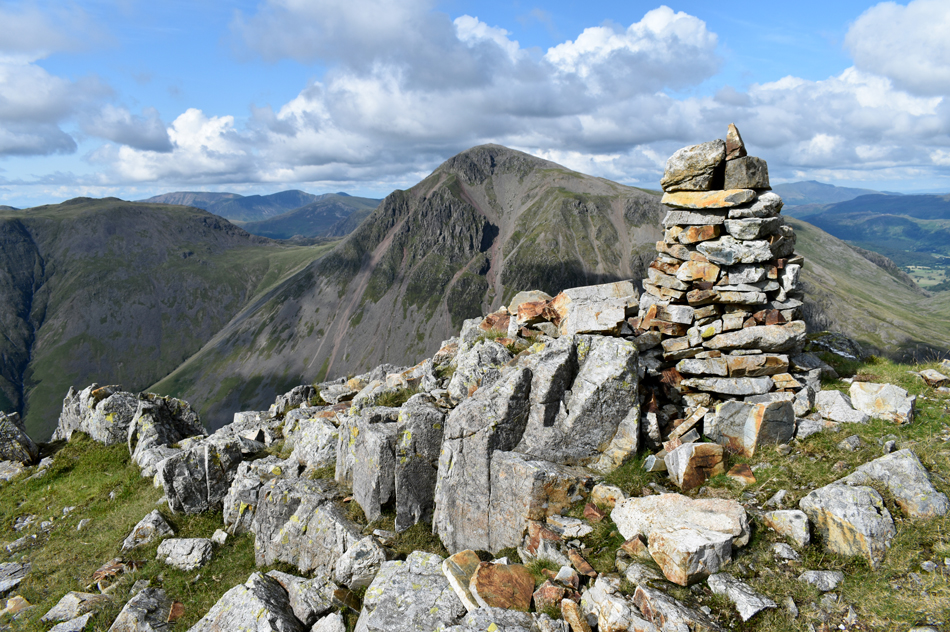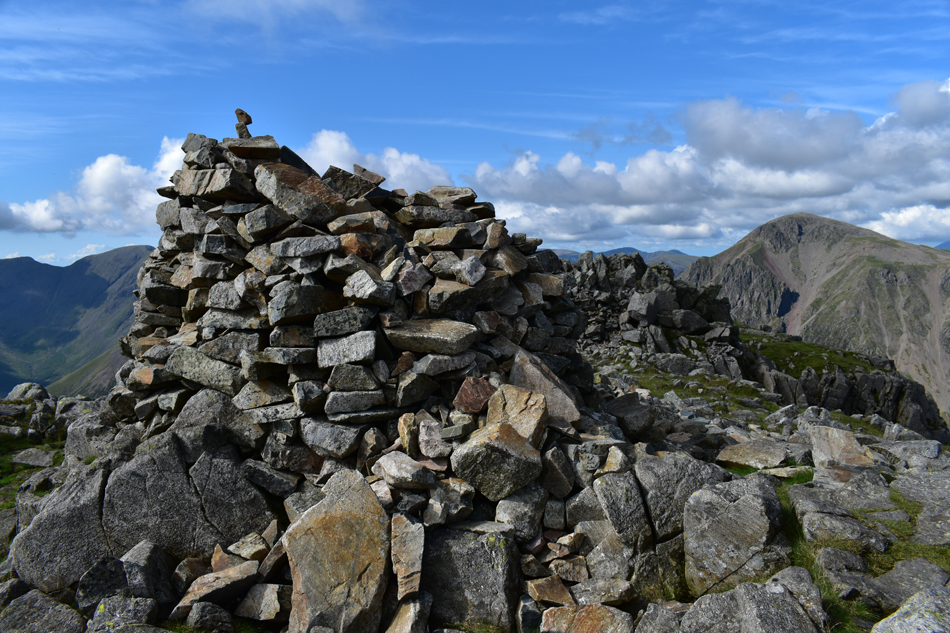 I traverse north towards the spectacular stone column which appears to have been rebuilt after my last visit which was such a welcome site. I drop below the column to take shelter from the summit breeze and break out a late lunch while taking in the view over Great Gable and Sty Head. |