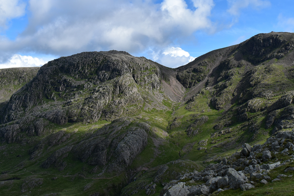 Mickledore is ahead seen centre with Pikes Crag and Pulpit Rock seen left and Scafell Crag over on the right. |