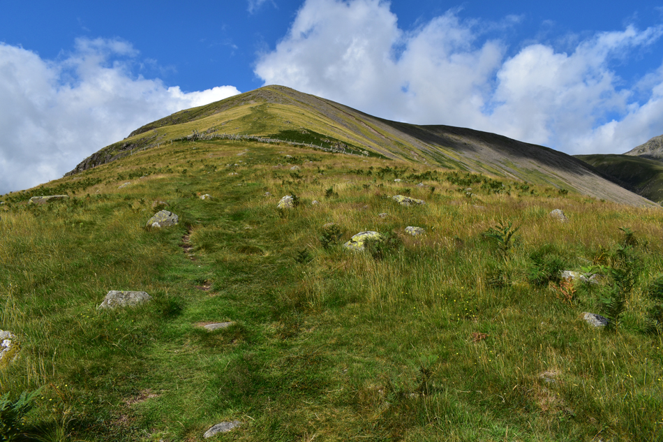 Having descending as far as the large cairn at Lingmel Col I left the path and followed a grassy narrow trod, passed over a section of broken wall and started the short yet steady ascent on Lingmell. |