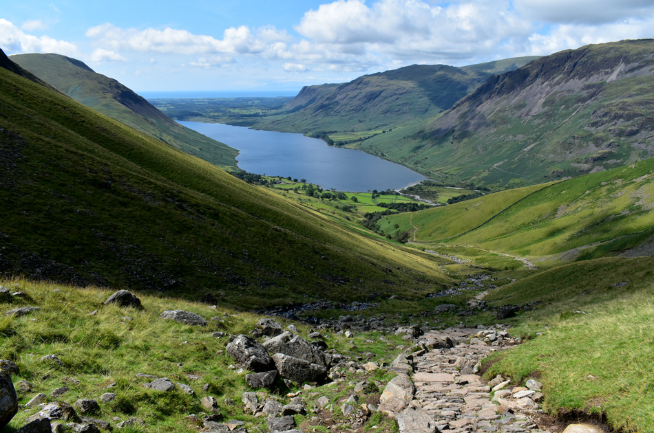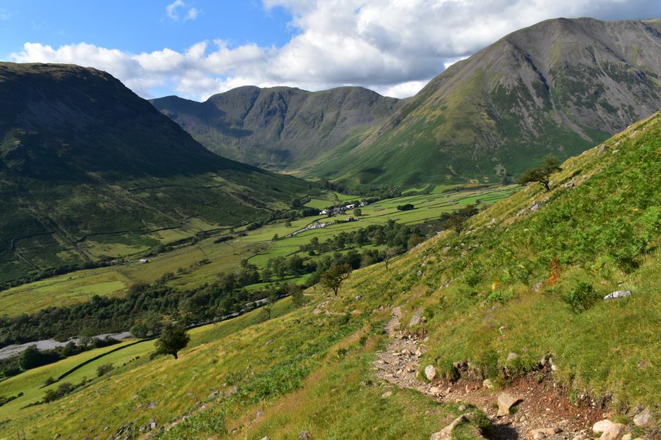 Heading back to Wasdale Head with views of Yewbarrow's North Top, Kirk Fell and Pillar. |