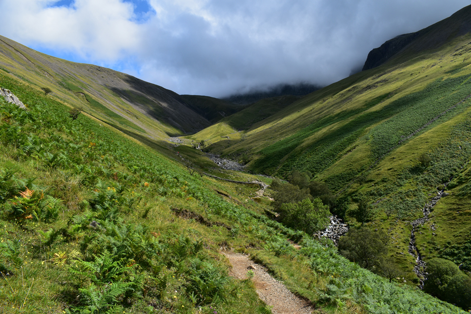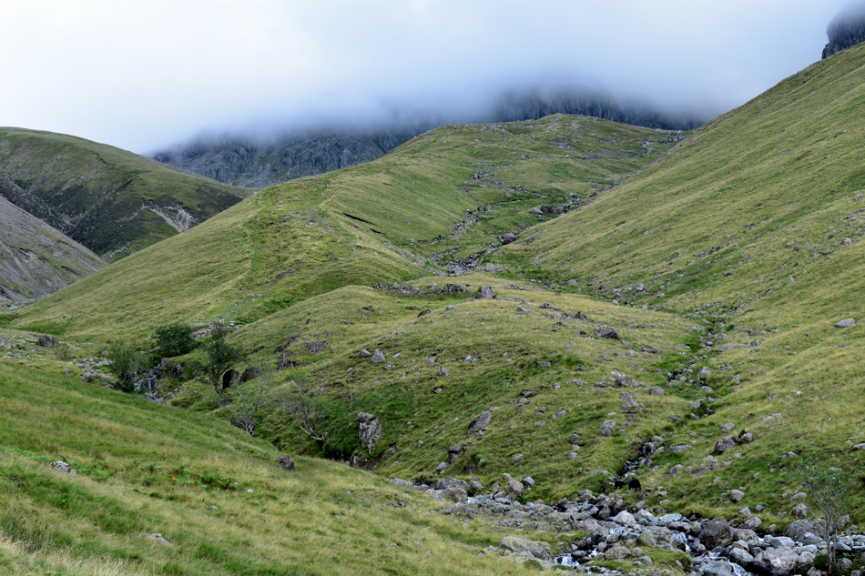 Within the shade of Lingmell and Green How I crossed Lingmell Gill at the stepping stones (seen by the trees centre left) and started the steady ascent of Brown Tongue. By now I had no-one behind me and the only people I would pass would be those on their way down which I couldn't help feel sorry for having missed out on the views from the summit which is still below cloud. |