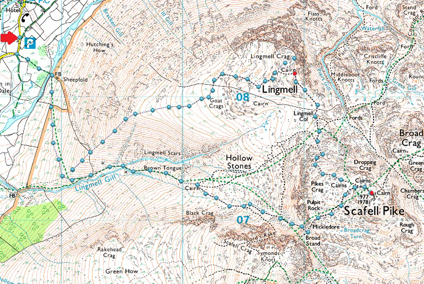 Wasdale Head - Down-in-the-Dale - Lingmell Beck - Lingmell Gill - Brown Tongue - Hollow Stones - Mickledore - Scafell Pike - Lingmell Col - Lingmell - Lingmell Crag - Goat Crags - Down-in-the-Dale - Lingmell Beck - Wasdale Head |