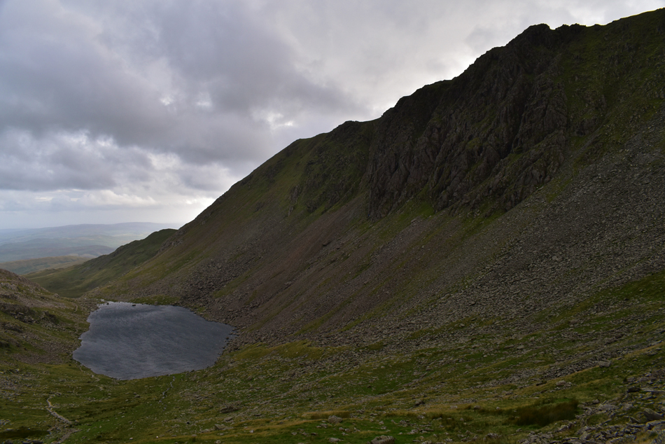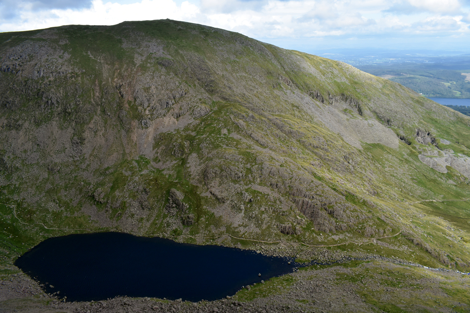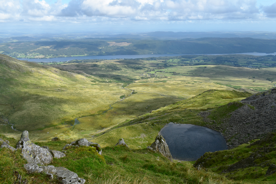 Looking down on Blind Tarn and The Cove with Coniston Water in the distance. |