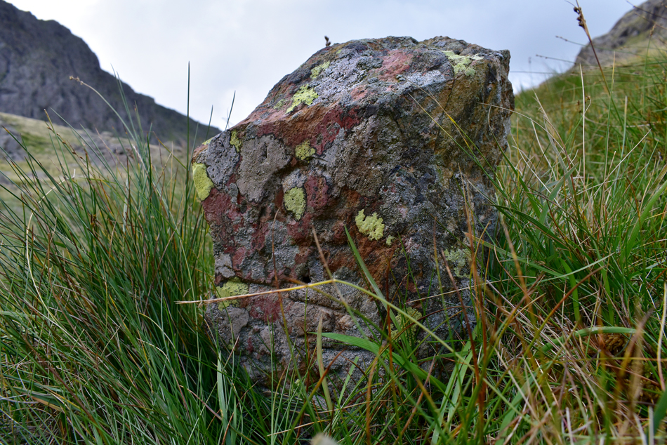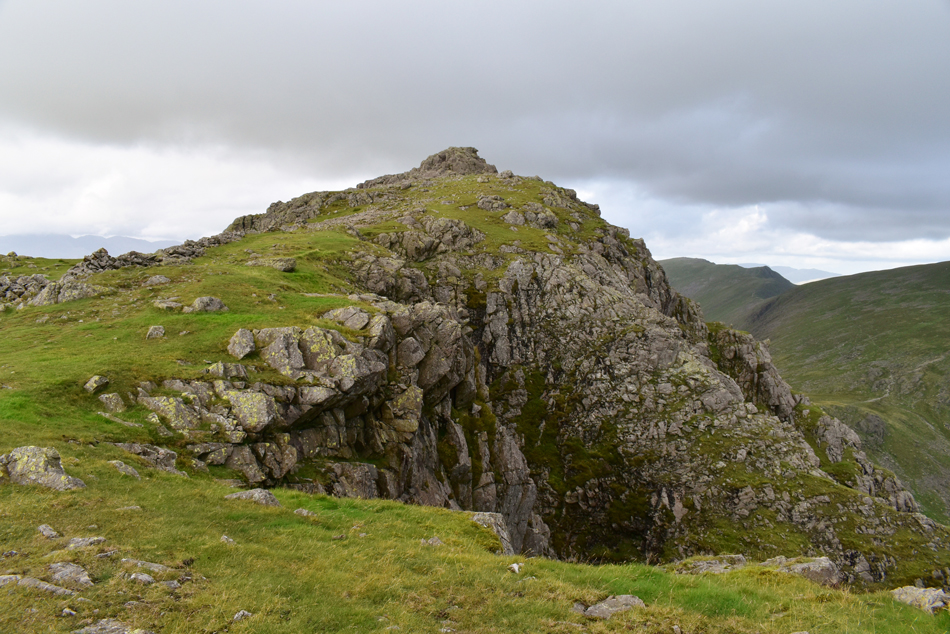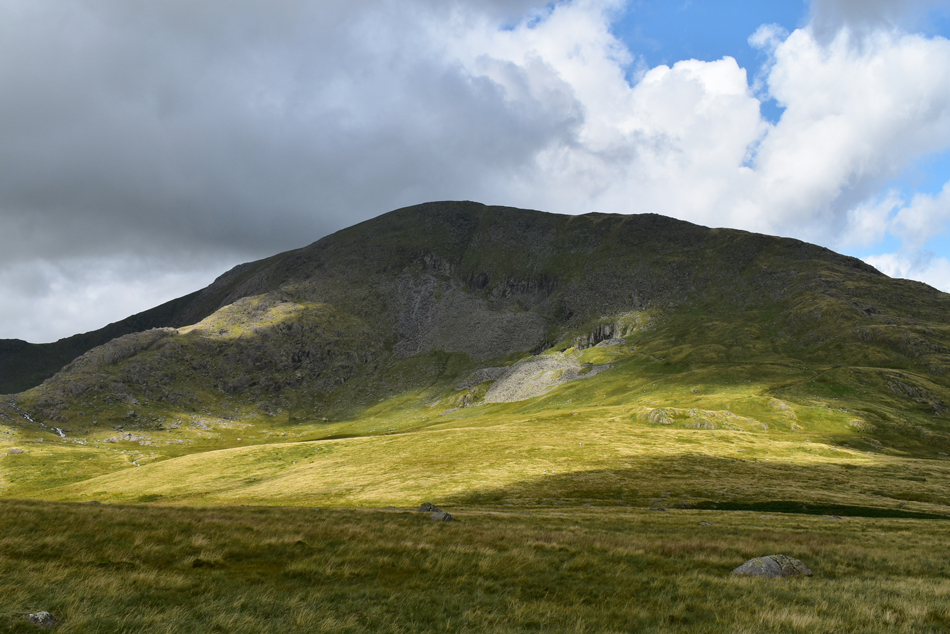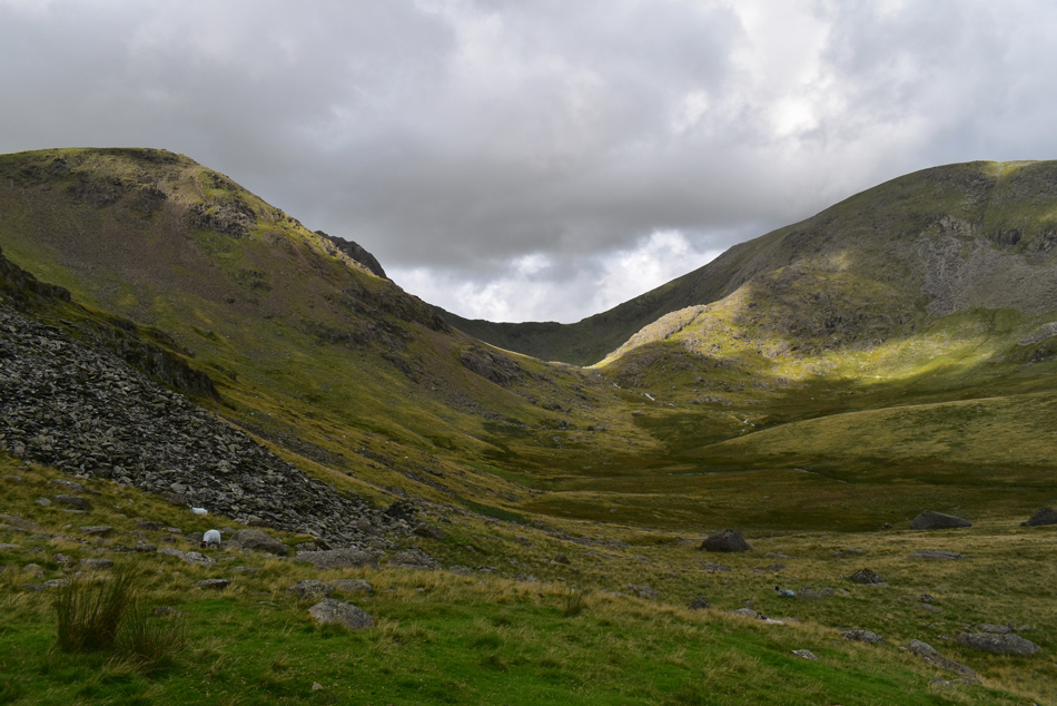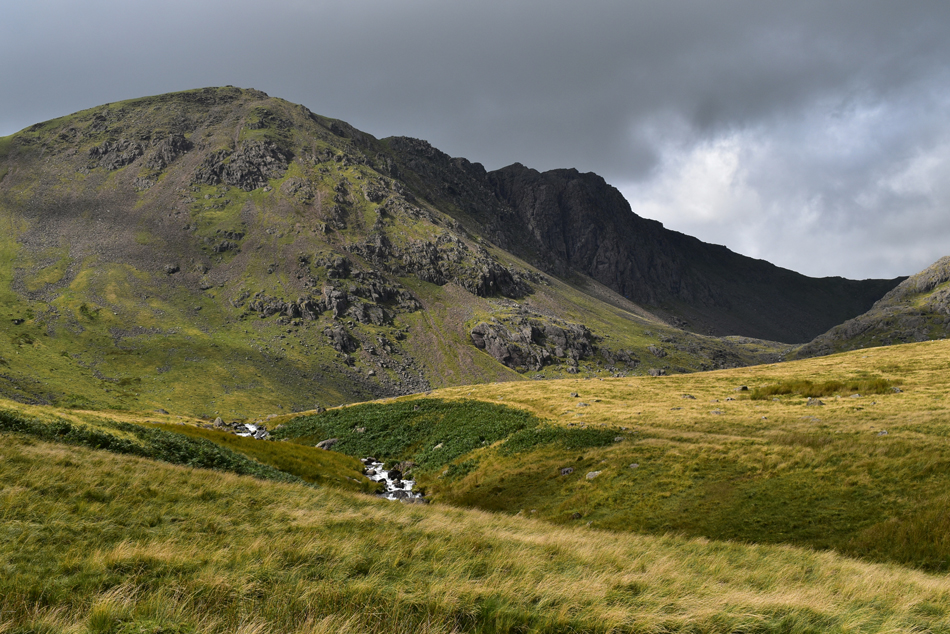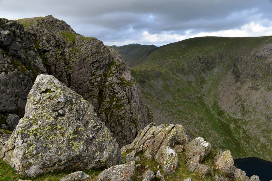 I decided to drop down from the ridge in between Easy Buttress and the South Rake if only to allow the cloud cover to pass and take shelter from the wind, afterall those clouds were hurtling across the sky at some pace. |