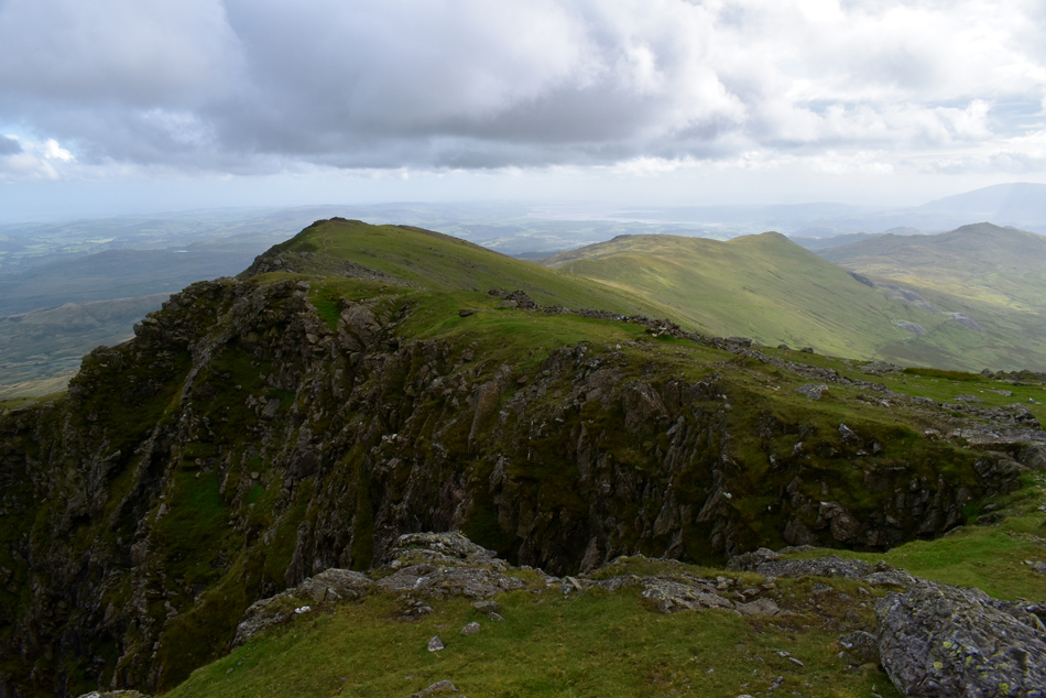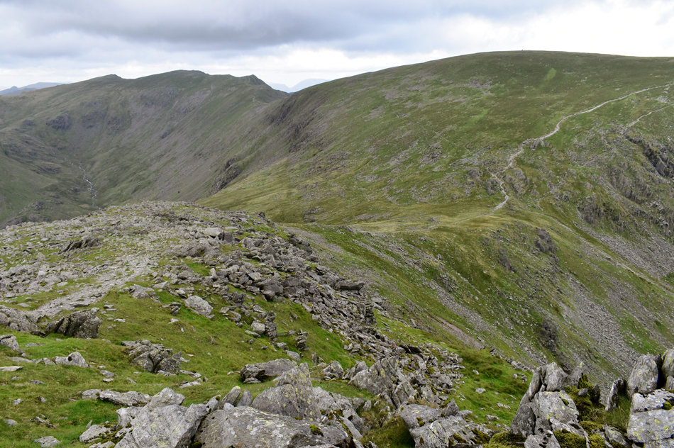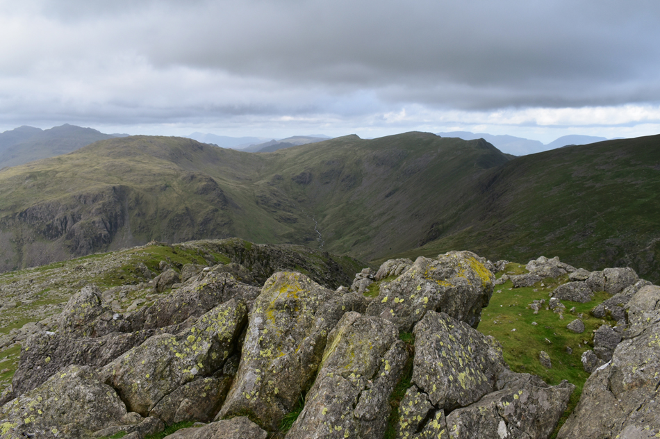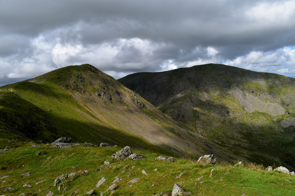 Looking back on Buck Pike, Walna Scar and White Maiden from the head of Great Gully. |