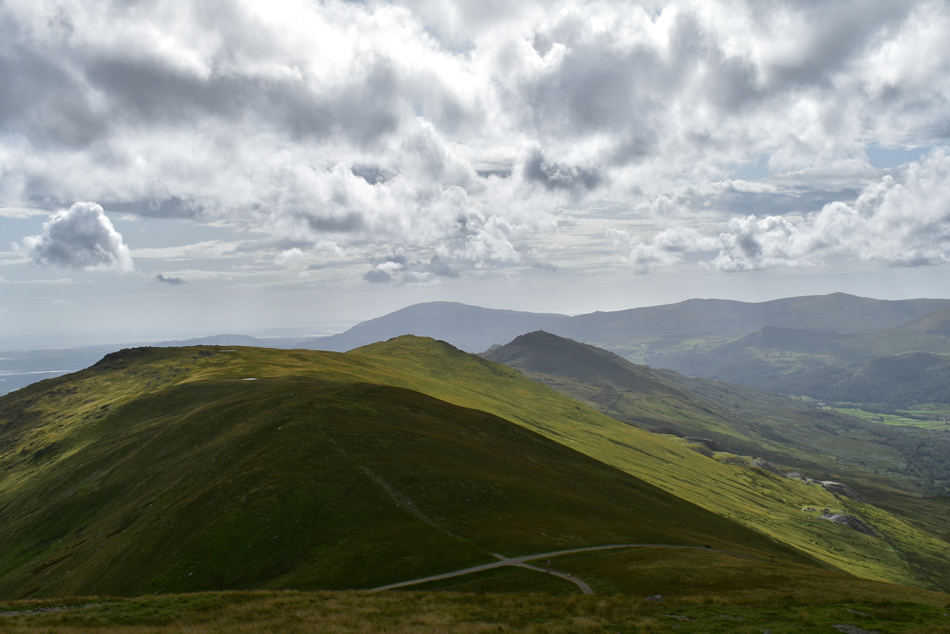 The view over the top of Walna Scar Road summit towards Walna Scar, White Maiden and Caw. |