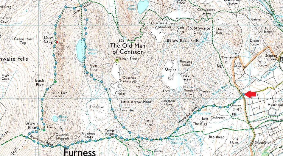 Fell Gate - Boo Tarn - Cove Bridge - Top of Walna Scar Road - Brown Pike - Buck Pike - Dow Crag - Goats Hawse - Goats Water - The Cove - Fell Gate