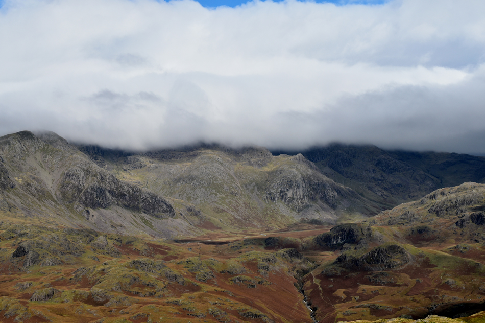 Here looking towards a cloud topped III Crag and the Scafells whilst Esk Pike, Bowfell and Crinkle Crags remain clear. |