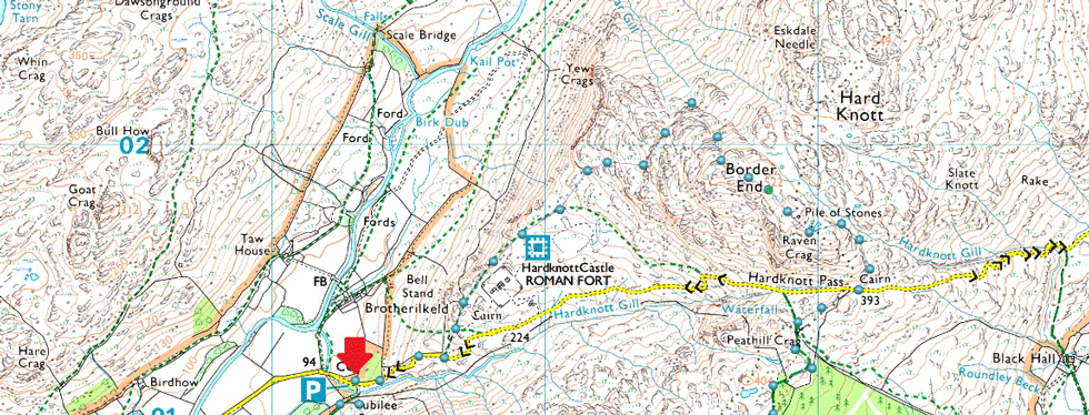 There is room for around eight well parked cars at Jubilee Bridge with further off road spaces found between Jubilee Bridge and Whahouse Bridge. The parking spaces are perfectly postponed to get into upper and lower Eskdale whether you aim for a walk up Harter Fell, Bowfell or the Scafells these spaces during summer are at a premium and my advice is to arrive early should you want to secure a parking place. Look out for the cattle grid at the bottom of Hardknott Pass (Jubilee Bridge itself cannot be seen from the road) parking can be found on the left if approaching from the top of the Hardknott Pass or just after the cattle grid on the right if approaching from Eskdale. Parking is free. |
