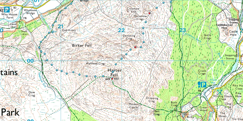 With a little less zoom Border End, Hardknott Roman Fort, Rowantree Crags, High Scarth Crag and Slight Side. |