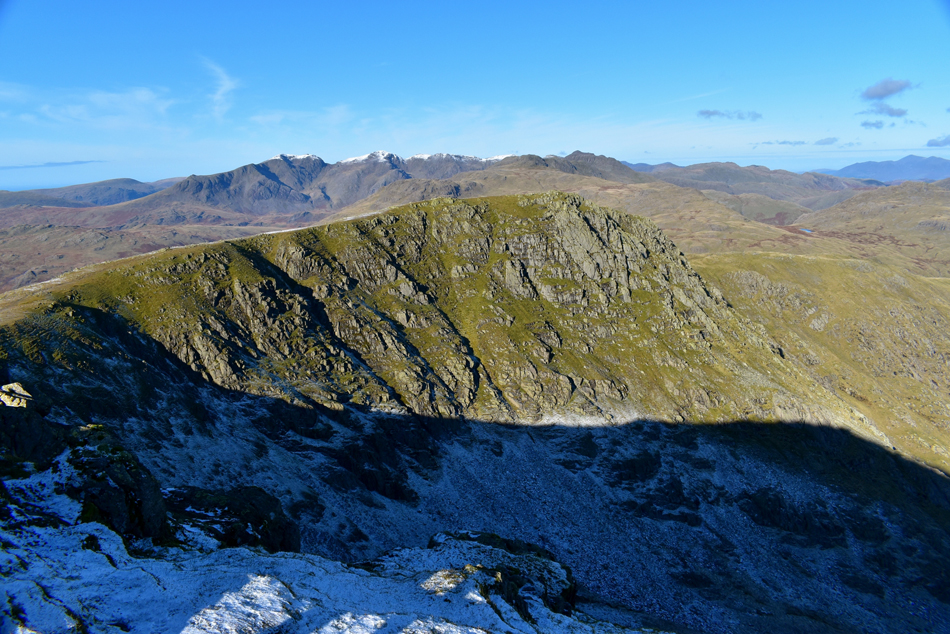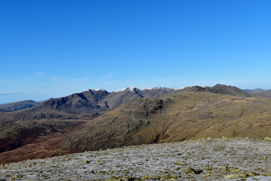 Little Stand, Crinkle Crags, Bow Fell, Esk Pike, Great End, III Crag, Broad Crag, Scafell Pike, Pen, Sca Fell, Cam Spout Crag and Slight Side. |