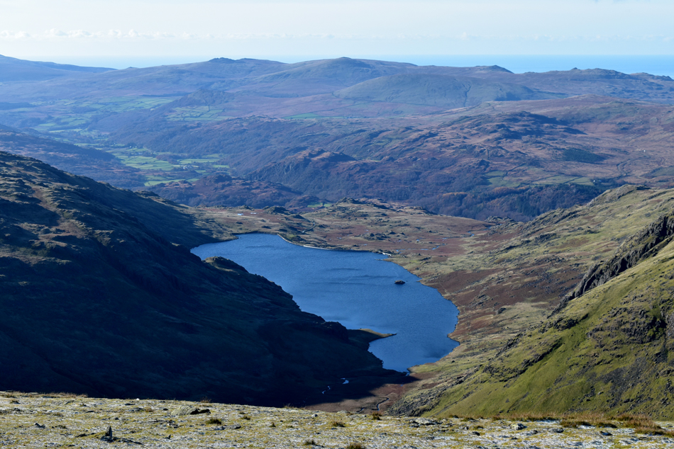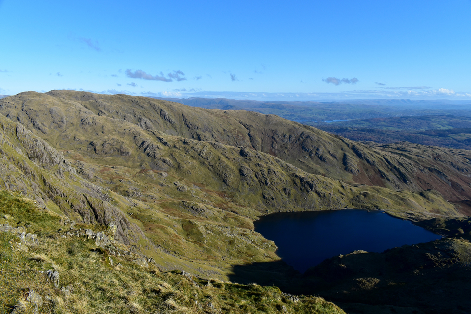 Looking down on Seathwaite Tarn as we cross the top of Swirl Band. |
