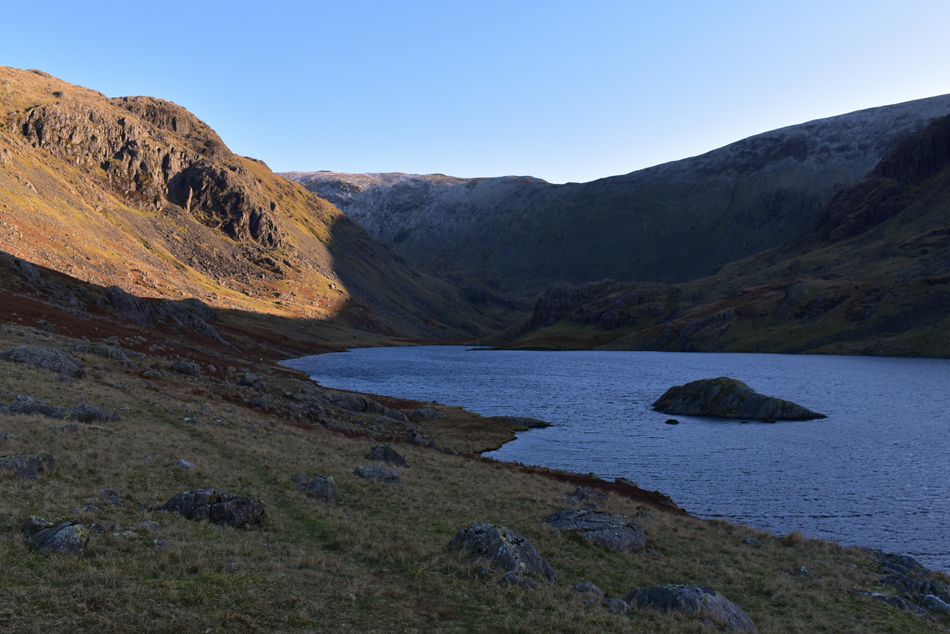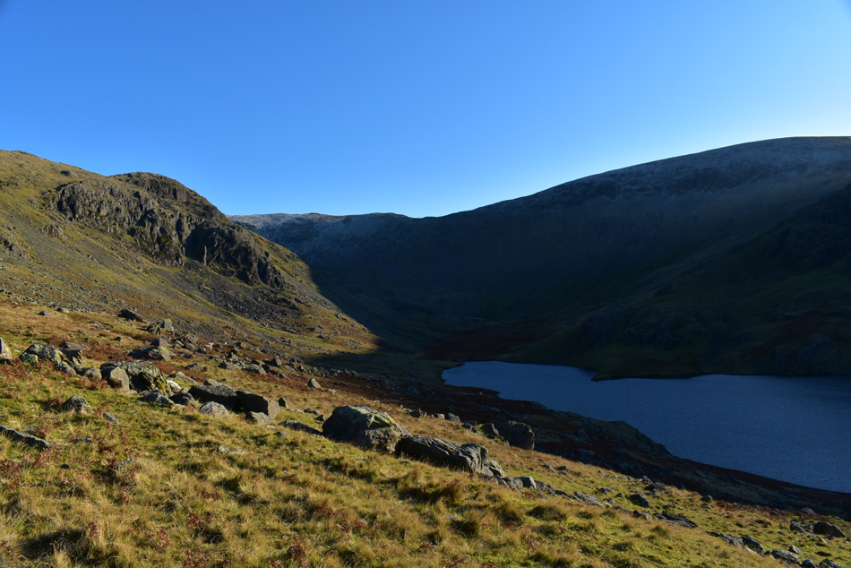 It didn't seem to take long to arrive at Seathwaite Tarn where we were met by a blast of cold wind, I'm sure that I can speak for Rod and Karl if I said we were eager to get into the sunlight now gracing the steep flanks of Grey Friar. |