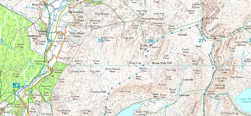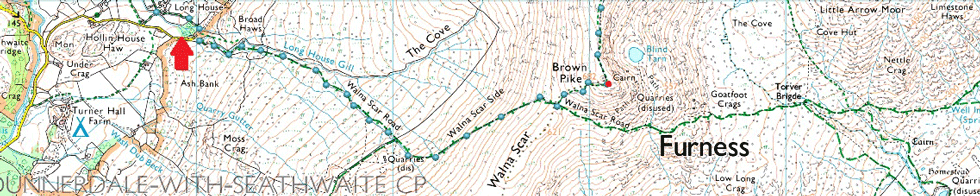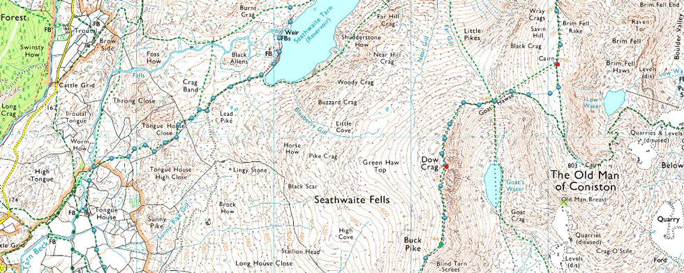 Bottom of Walna Scar Road, Seathwaite - Tongue House - Seathwaite Tarn - Grey Friar - Fairfield - Great Carrs - Top of Broad Slack - Swirl How - Levers Hawse - Brim Fell - Goat's Hawse - Dow Crag - Buck Pike - Brown Pike - Walna Scar Road back to Seathwaite |