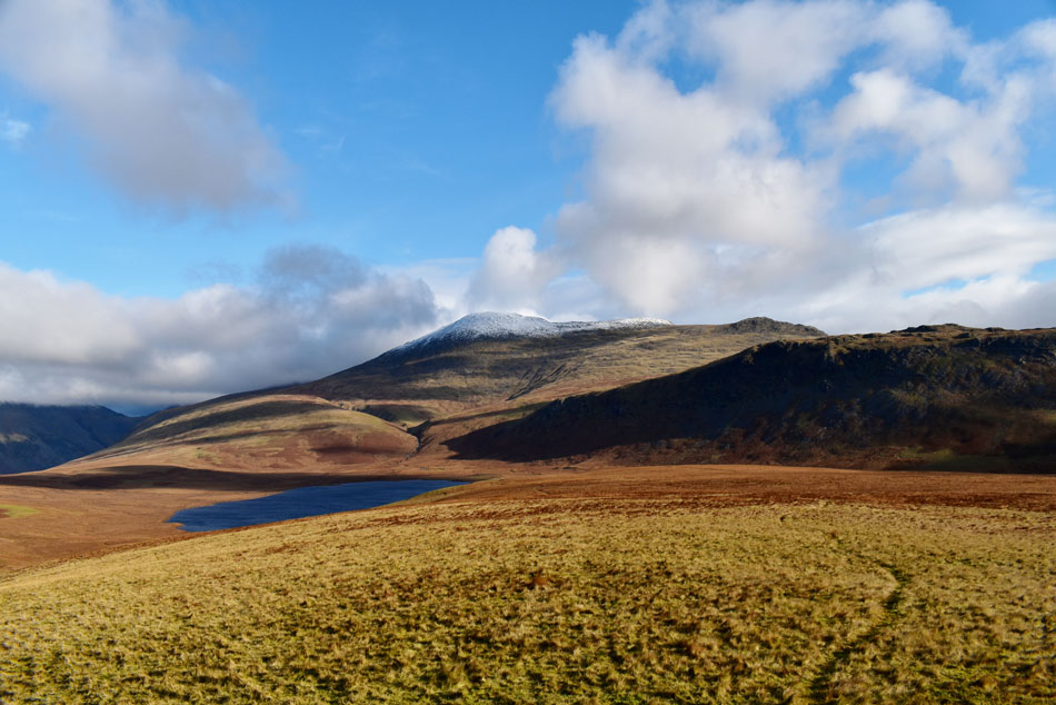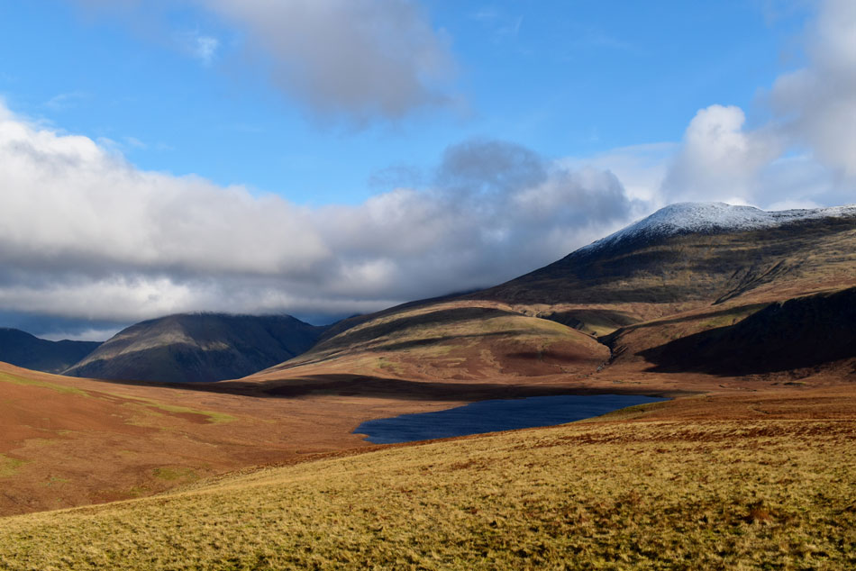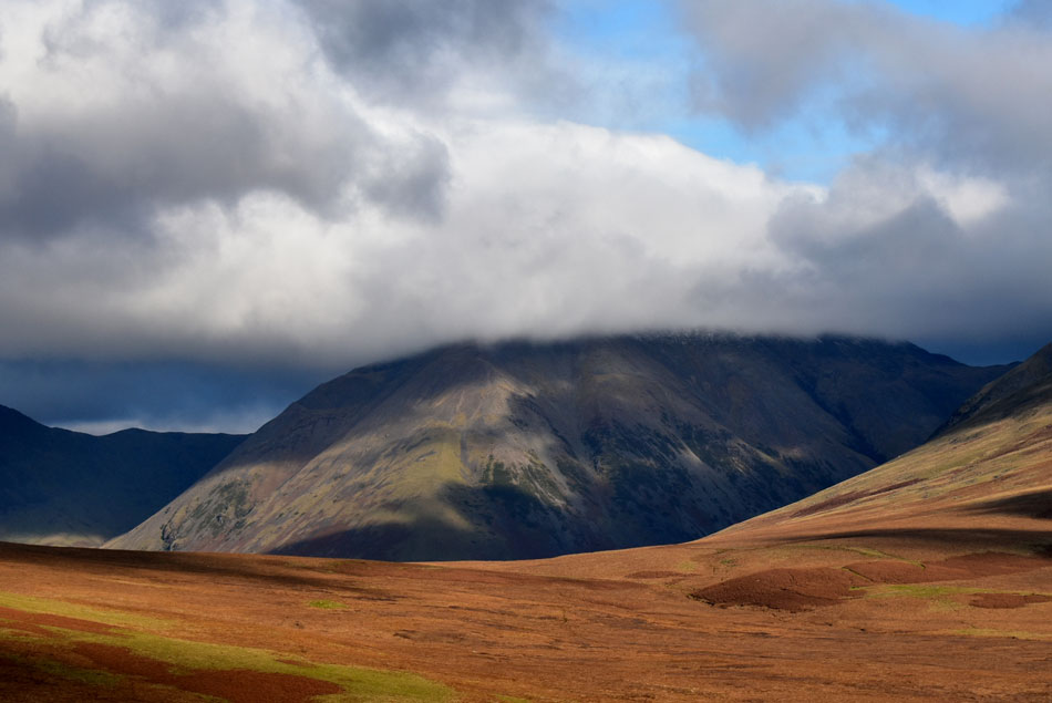 Kirk Fell and Sca Fell seen over Burnmoor Tarn from Boat How summit. |