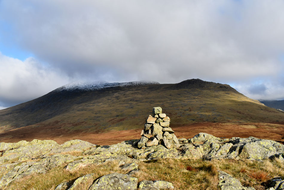 With the tough ascent of Bleaberry How behind me my heart rate returns to normal and a fine cairn is passed at the summit of Raven Crag. Great How summit is due east which took me past three tarns this one being the largest. |
