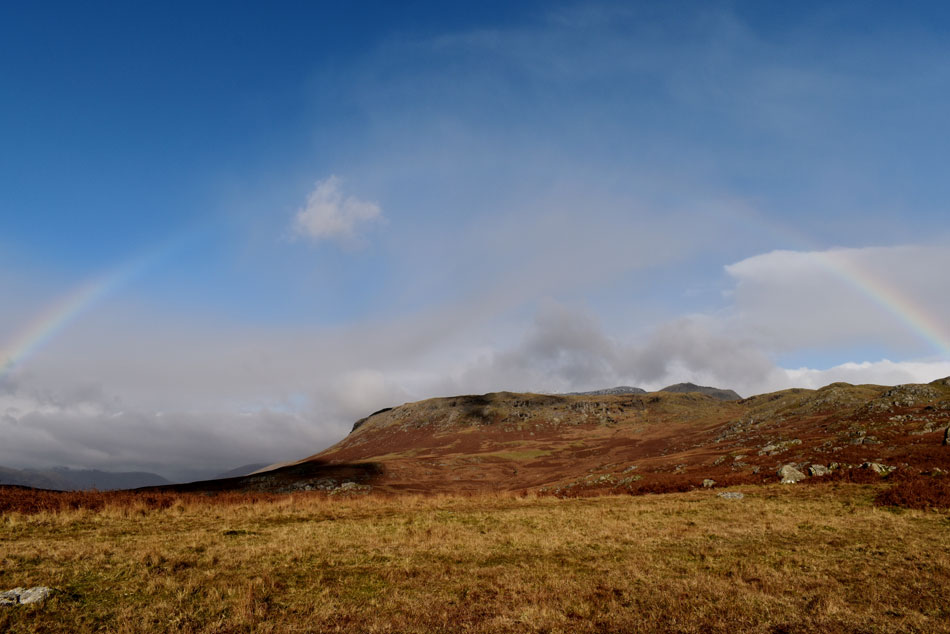 With Stony Tarn behind me I make my way towards Eel Tarn found about half a mile away where I caught the fringes of a passing shower followed by this lovely rainbow over Great How. |