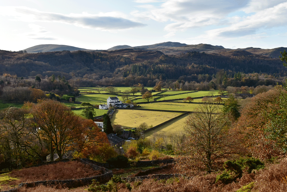 If you squint you might be able to make out what Birkett describes as the 'umbrella shaped monkey tree' within the patchwork of walls below Great Barrow, it actually looks like a Scots Pine that's seen better days to me but I like Birkett's description better.