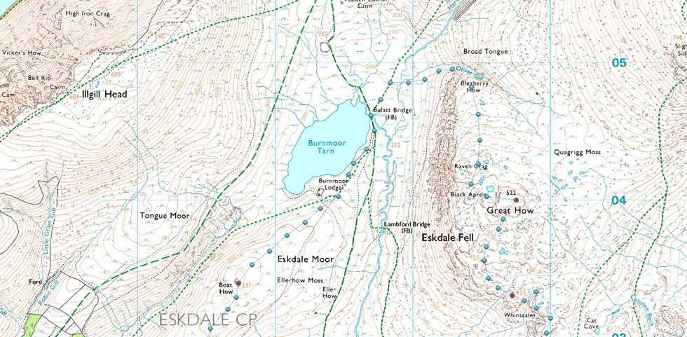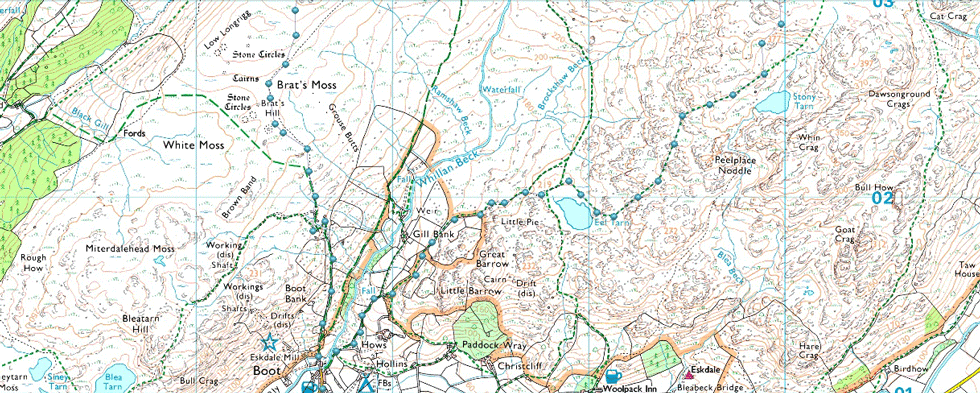 Dalegarth Hall - Eskdale - Boot - Brats Moss - Boat How - Burnmoor Tarn - Bulatt Bridge - Oliver Gill - Bleaberry How - Great How - Whinscales - Stony Tarn - Eel Tarn - Gill Bank - Boot - Dalegarth Hall |