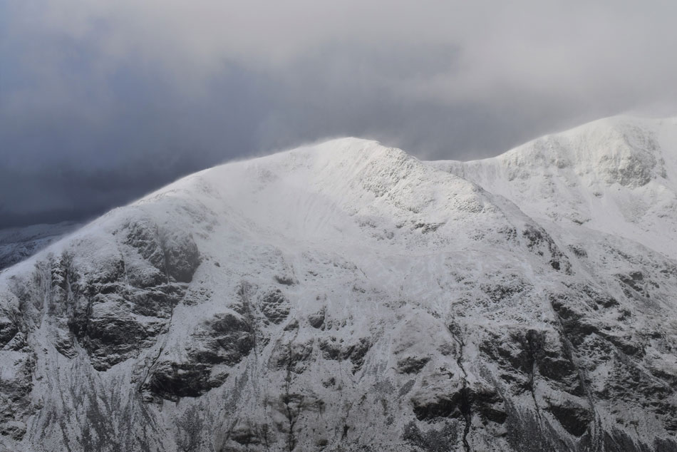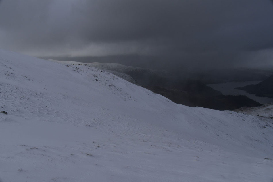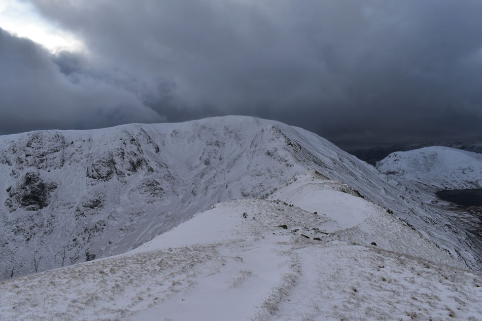 Spindrift over Dollywagon Pike, Cock Cove, The Tongue, Ruthwaite Cove and Nethernost Pike. |