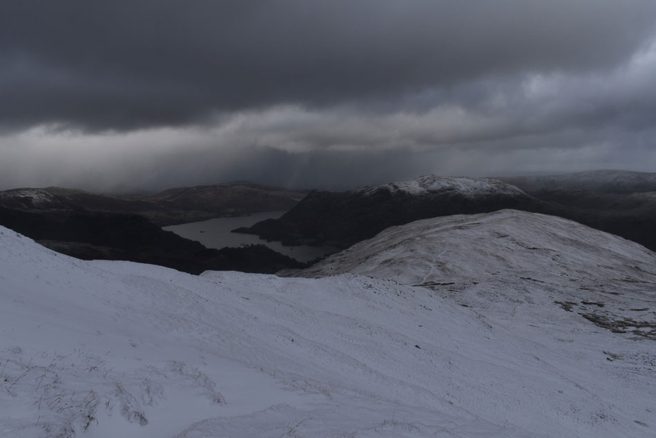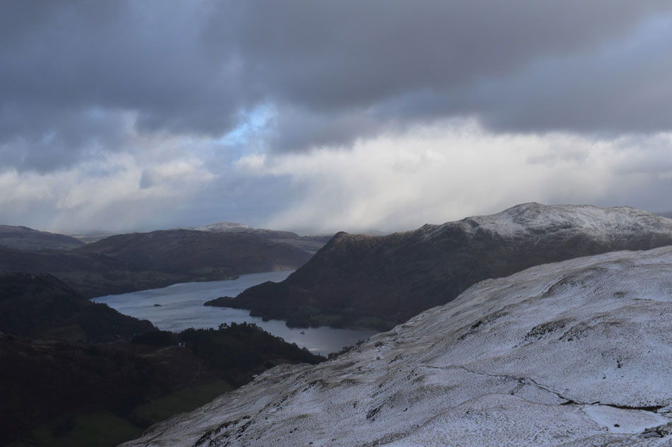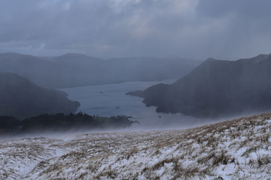 Birk Fell (Place Fell) and Ullswater seen during another hail shower. |