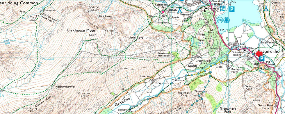 Patterdale alongside Glenriddging acts as a hub for the eastern and far eastern fells yet unlike Glenridding Patterdale doesn't have a centralised car park. With this said parking in Patterdale, especially during the height of Summer can be a problem with only two main sites to leave your car. The first is very popular with fell walkers which is just opposite the White Lion Hotel, here you will find a short layby with room for up to five parked cars. Parking is free. The second place to park is found just outside Patterdale Primary School where you can park on the kerb right outside the School, here you will find spaces for around three to four well parked cars. Parking is free. |