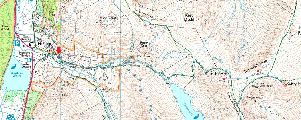 A very popular car park in the hamlet of Hartsop giving access within the heart of the east and far eastern fells just a few minutes stroll away from Brothers Water. The car park is situated at the end of a narrow lane which provides the backbone to the village. An honesty box can be found next to the gate at the far end of the car park. |