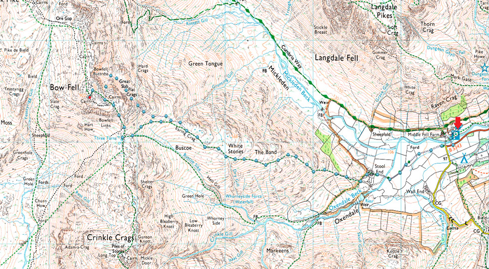 Old Dungeon Ghyll – Stool End Farm – The Band – Bowfell Climbers Traverse – Great Slab – Bowfell – Three Tarns – The Band – Stool End Farm – Old Dundeon Ghyll |