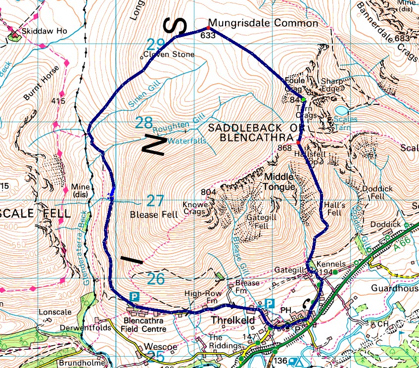 Threlkeld - Gategill Farm - Hall's Fell Ridge - Hall's Fell Top (Blencathra) - Atkinson Pike - Mungrisdale Common - Cloven Stone - Blencathra Centre - High Row Farm - Threlkeld |