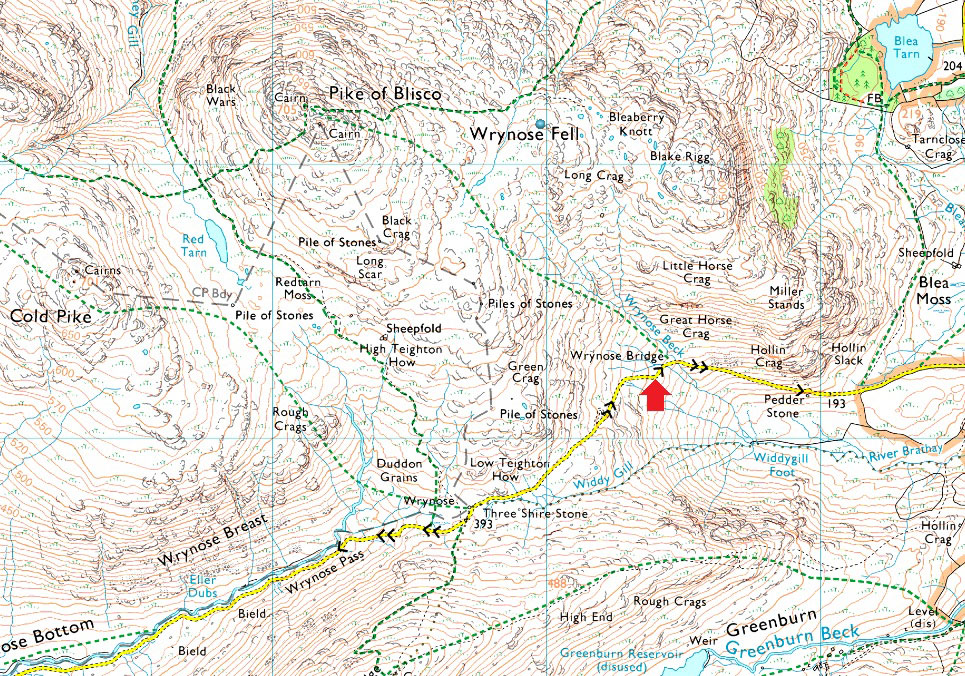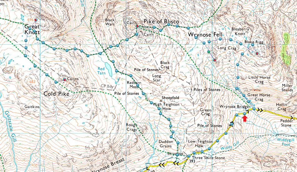 Wrynose Bridge - Wrynose Beck - Blake Rigg - Long Crag (Wrynose Fell) - Pike O'Blisco - Red Tarn (Langdale) - Great Knott - Cold Pike - Red Tarn (Langdale) - Redtarn Moss - Three Shire Stone - Wrynose Pass - Wrynose Bridge |