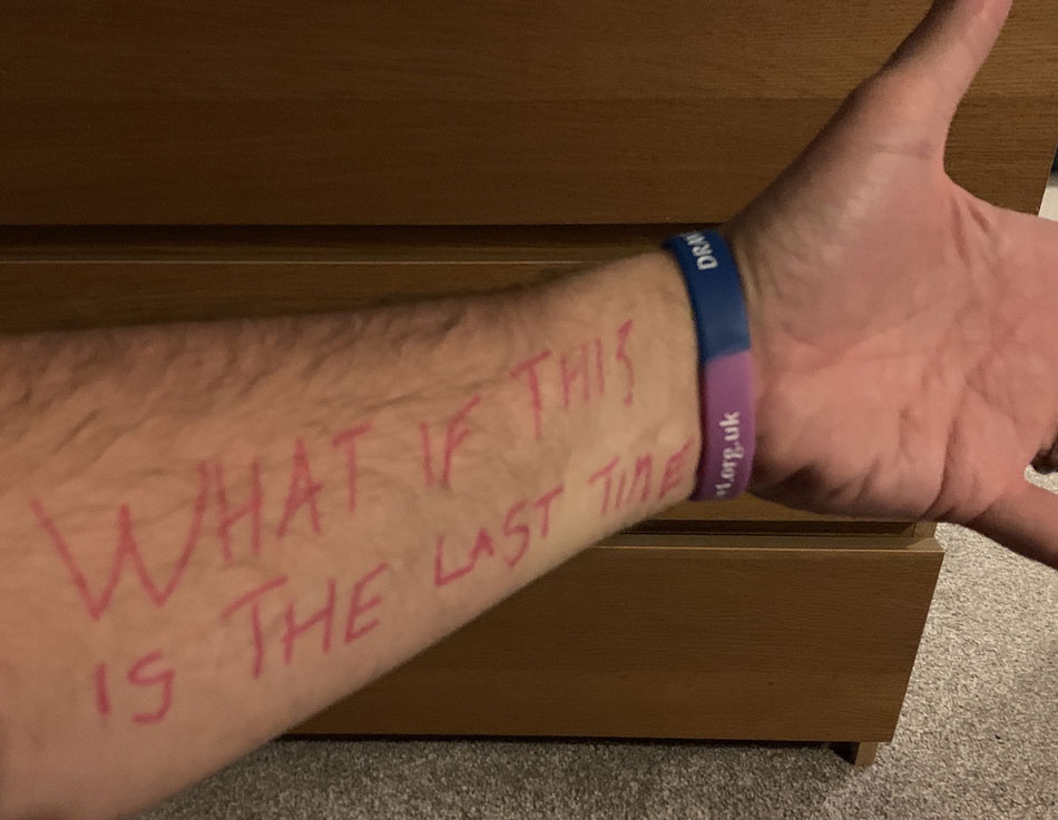 I ate my usual porridge and toast. I kitted up, it felt like putting on my armour. On my arm I had written a mantra....”What if this is the last time?” .... I nervously ate.