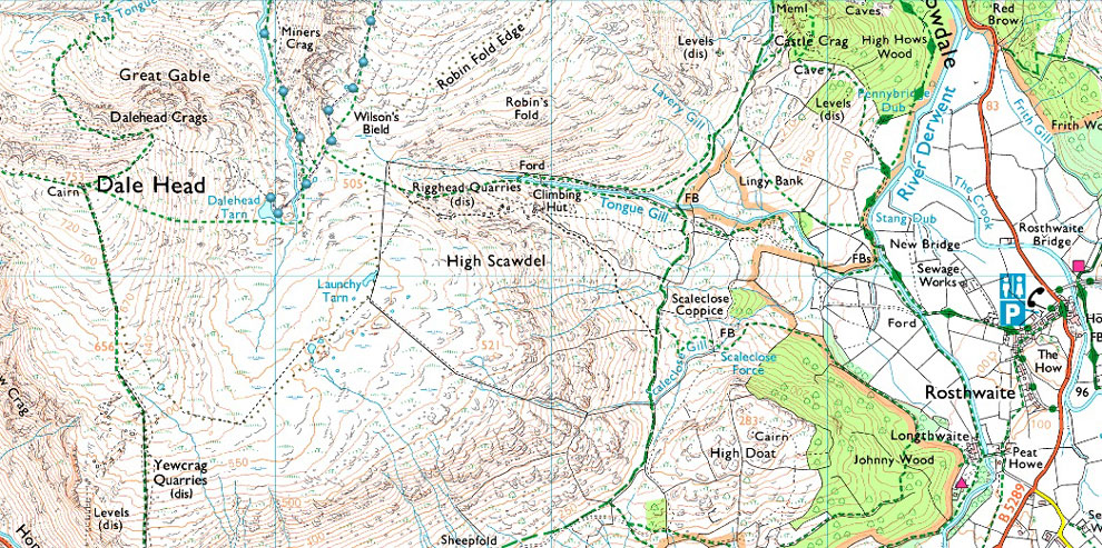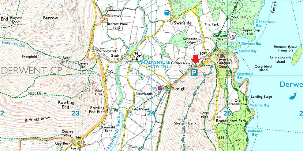 There is room for around ten well parked cars at Gutherscale which is perfectly postioned for a quick walk up Cat Bells or a full day on the Newlands Fells. Leave the A66 for Portinscale and pass through the village before the entrance to Nicol End (Derwent Water) appears on the left, continue to follow the road which forks right signposted (Stair and Newlands Valley) Keep left here and continue to follow the road which sweeps around a right hairpin bend before passing over a cattle grid. The parking spaces will appear around 300 yards further on the left. Parking is free. |